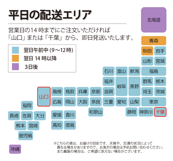 平日(土日祝を除いた日)は、「山口県」と「千葉県」からの発送を行っております。